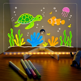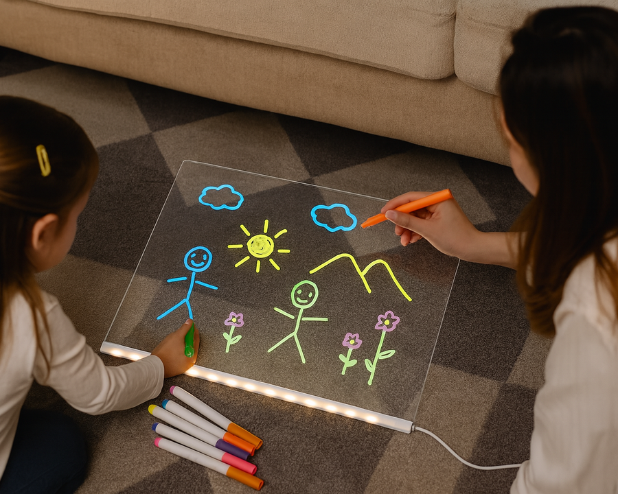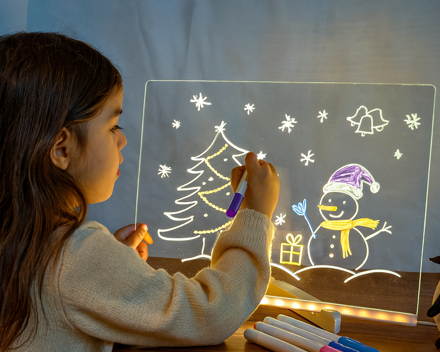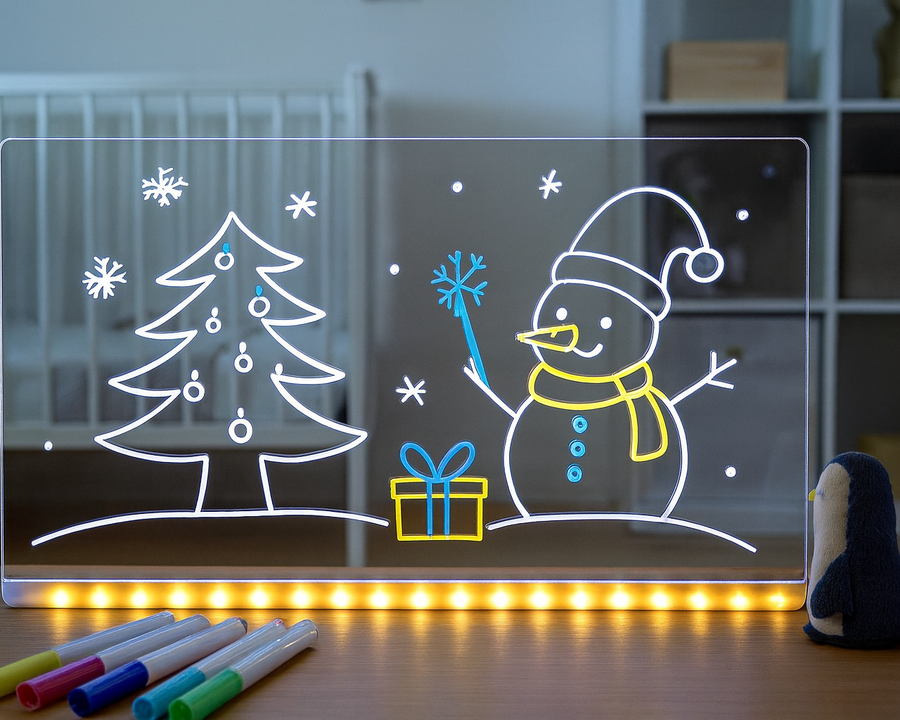 Világító rajztábla – áttetsző, LED-fénnyel megvilágított felület, amelyen az üzenetek és rajzok ragyogó színekben tűnnek ki.
